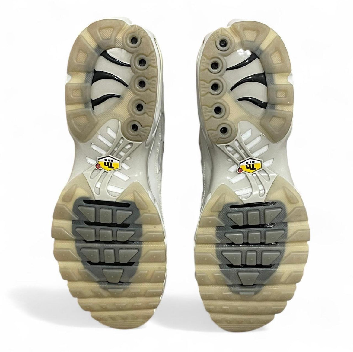 This Nike Air Max Plus features an Off-White leather upper with thermo-molded exoskeleton overlays, replacing the traditional mesh base and TPU overlays. Contrasting hits of Light Bone appear on the laser-etched Swooshes and compact squares on the sides. Branding details include "ACW" lettering on the shank plate and a co-branded tongue, insole, and heel. Other details include Off-White laces and "Tn" branding on the heel and sole unit. A matching Polyurethane (PU) midsole with visible Air cushioning at the heel and forefoot rests on a translucent rubber outsole.